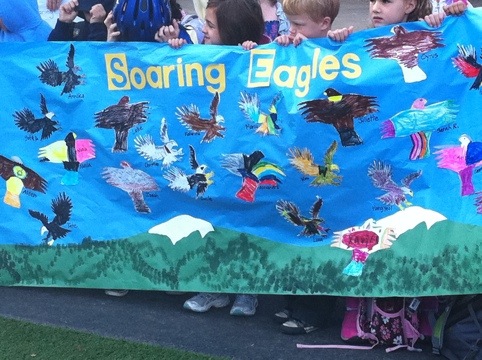This week every homeroom created their class banners in Art! Each homeroom votes on a student generated class name. In the art room a background and templates are uniquely designed to suit each class! Our principle Mrs. Whisnant set aside a grand unveiling of the banners Friday morning to share the students completed banner and commitment to build the thoughtful community we strive to be: Cooperative, Respectful, Peaceful, Kind and a few more!