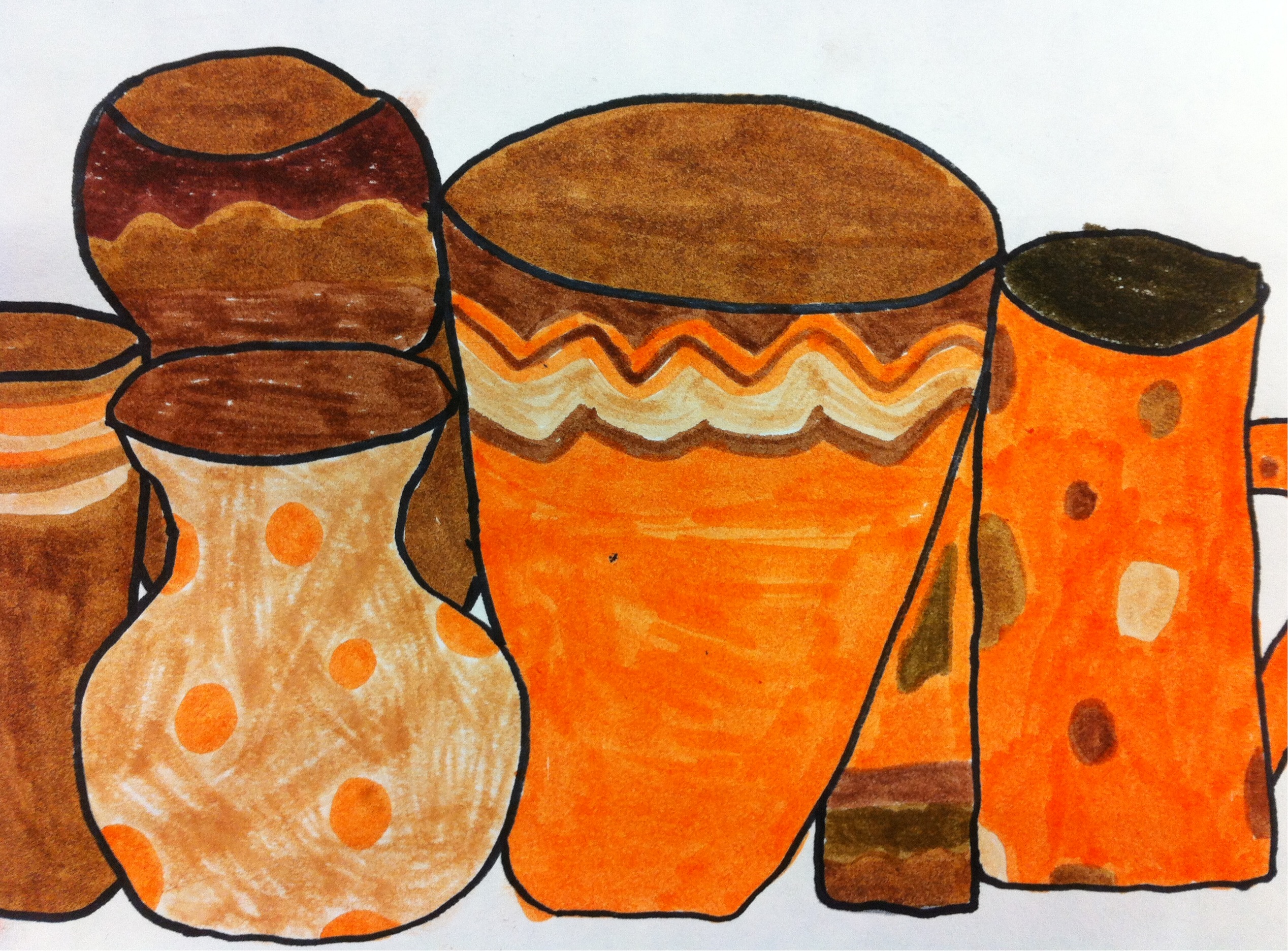 This object in a series work provided insight to creating more units where the student is able to carry their knowledge and make deeper connections. My mind flows to thoughts of how composing descriptive writing, the performance arts and detailed drawings have similar language. Moments and words come to life and more powerful with tone, sound, emotion and detail. As these delightful vessels in two and three dimensional form take on a new life in drawing, printmaking and clay using form, texture, pattern, color, line and shape!