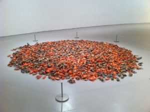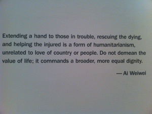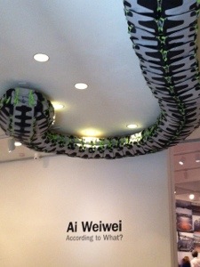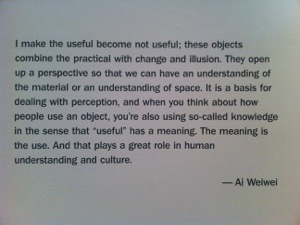 Riding the city bike to the Hirshhorn yesterday was so much fun! The leaves on the streets, tourists, crinkle of gravel on the mall and pumping peddles with sound of train pulling in to Union Station on my way home were the highlights of the ride. The visit to the Hirshhorn blew me away in seeing the artwork of Ai Weiwei for the first time. There is no way at this moment that I could describe his work as others critique with such detail and elegance, but I will say that his work and message leave me excited to be human. His materials and message motivate me to think and care about this world we share. My professor told me to go & check out his use of tea, the last photo. The exhibit is fantastic and am very curious about the relationship or choice of the surveillance camera and helmet in marble. I certainly appreciate the camera, because of all the annoying cameras we have in the city and the helmet for opening up all these great revitalized parts of the city to check out!