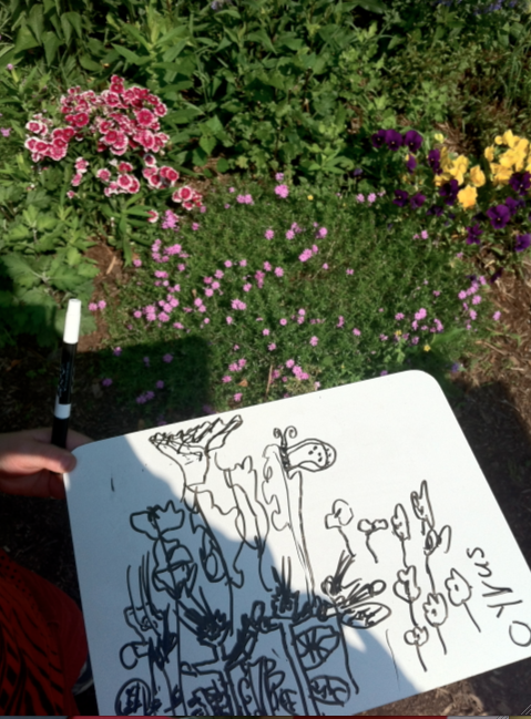 First graders step outside to our very own garden on campus to sketch plants, flowers, herbs and veggies. These sketches become paintings as we take a look at the garden painting by Van Gogh and farmers market painting of Gustave Caillebotte