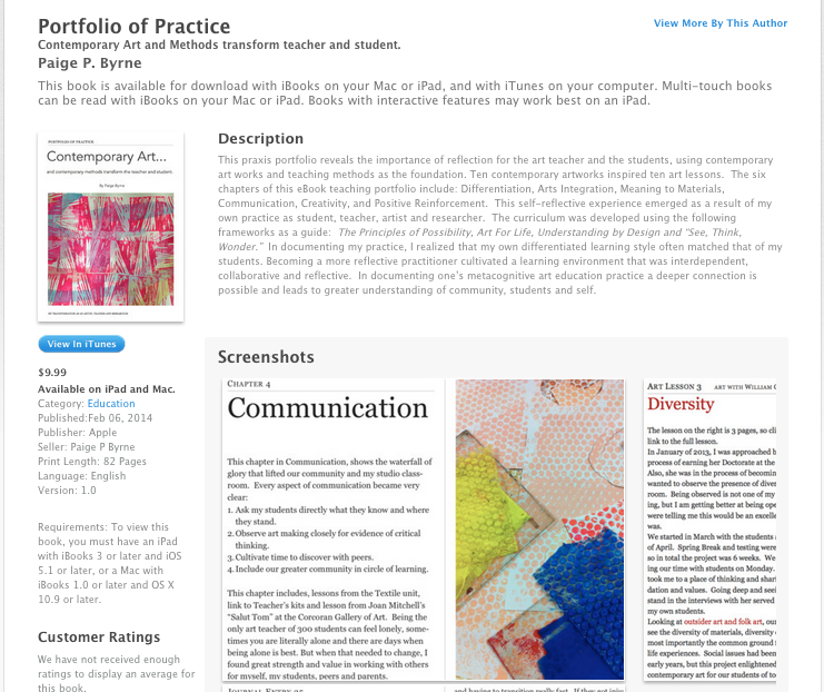 Portfolio of Practice is a great resource for elementary art teachers (and older as my classmate informed me) to incorporate contemporary art and methods into your studio classroom. No longer will I teach “how to paint a symmetrical butterfly using warm and cool colors in five steps.” Contemporary art and methods using ten artists from the Corcoran Gallery of Art Collection lifted my work as an artist, teacher and researcher. Each art exploration is at the end of each chapter for you!
