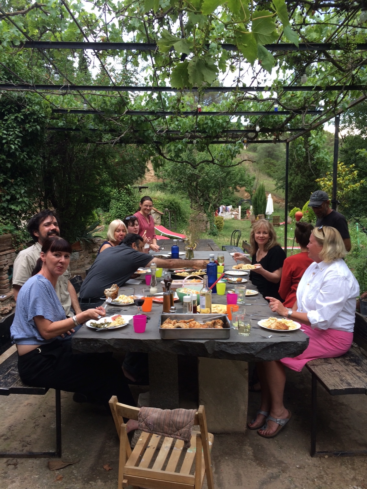 This opportunity provided everything needed: a place to sleep, a table to eat and a room to work. It really was that simple. Can Serrat surroundings were so full of blue skies, dry heat, chirping birds, gentle breezes and quiet. There was no television, unpredictable internet and no noise from street. I sponged up the surroundings in my work by going out to see the small town, the mountains and olive trees, the architecture of Gaudi in Barcelona and salty sea of Sitges by walking to town over broken tiles and along warm yellow facades. The open tour bus in Barcelona delivered views of the ornate and organic styles throughout the city. A train to seaside Sitges just outside Barcelona and funicular up Monserrat exposed the tunnels and tracks built along and around the protected landscape. Every night at 7pm we gathered at this table to share our days and on Fridays we shared our work by the campfire or studios. For my students we will share how everything we need is right in front of us to take us to new places.