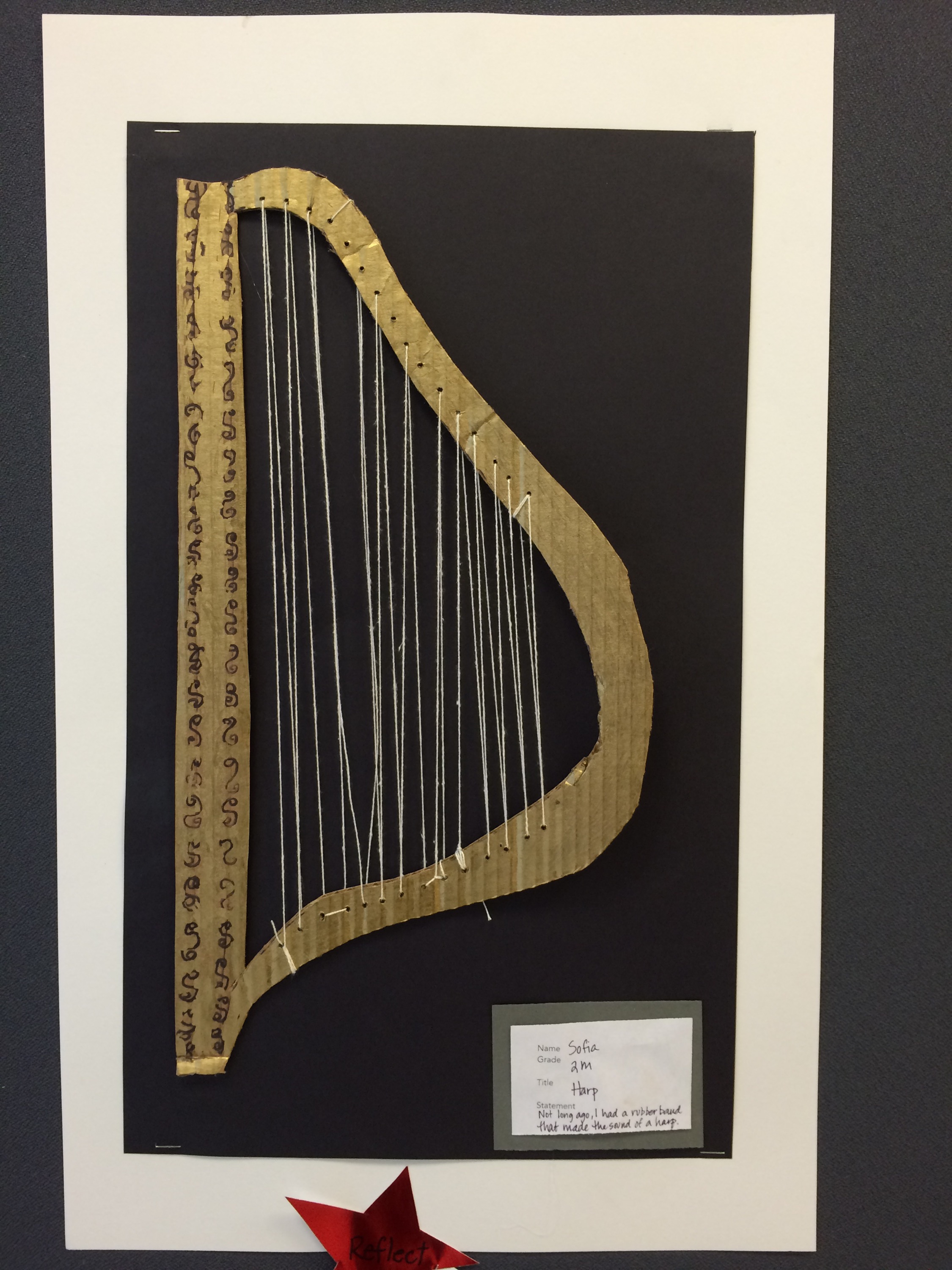 Students work immediately popped in my head when reviewing the descriptions of studio habits of mind. We posted habit & description by each work and chose two per grade level. Reflect: Sophia is reflective in the process. The inspiration for this harp was her memory of the sound a rubber band made.