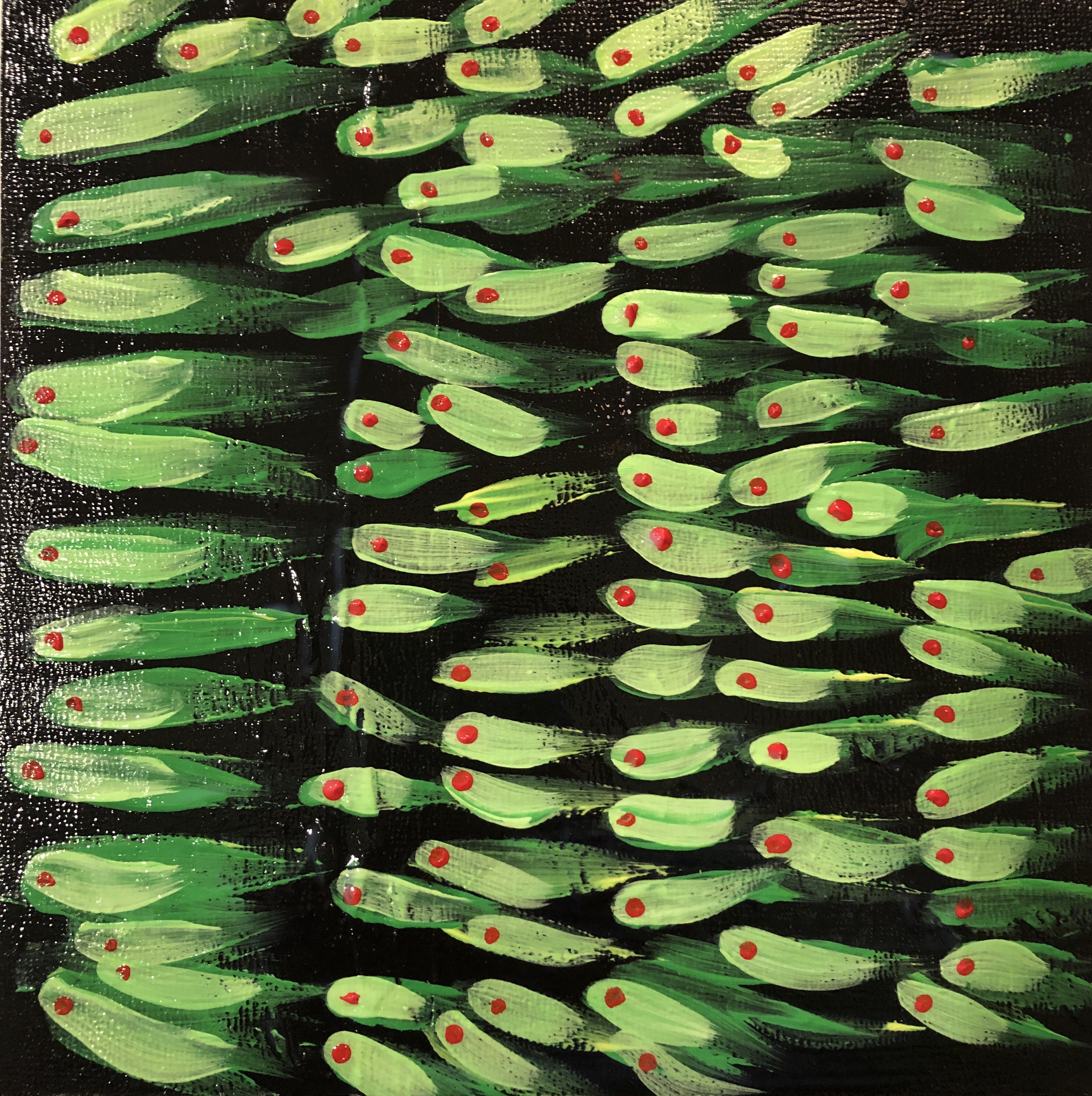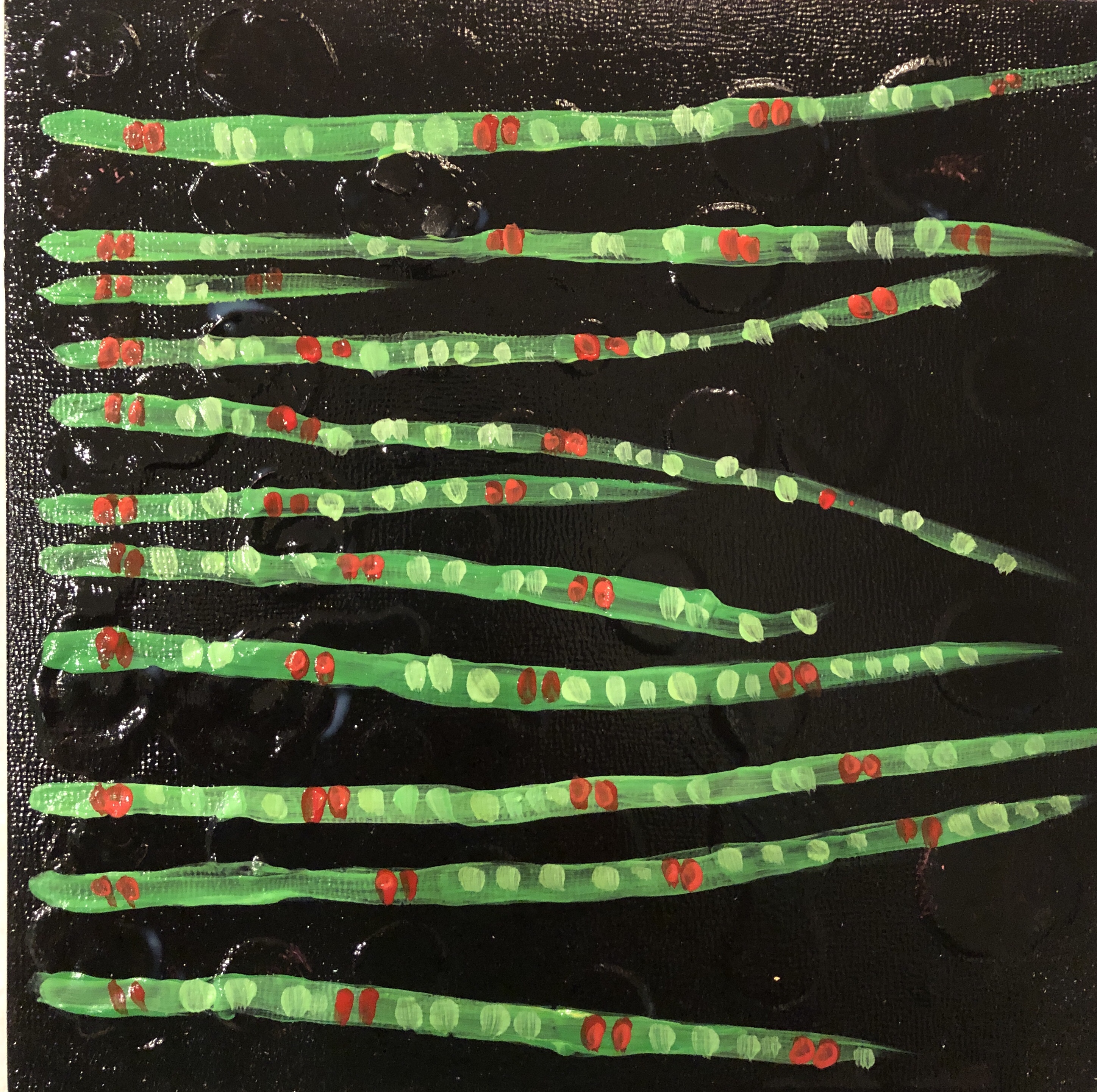 Process: Layers of paint and patterns of thick paint to let dry with last layers being a few coats of black. The grass blades were painted in singular and layered brushstrokes and pattern applied last.